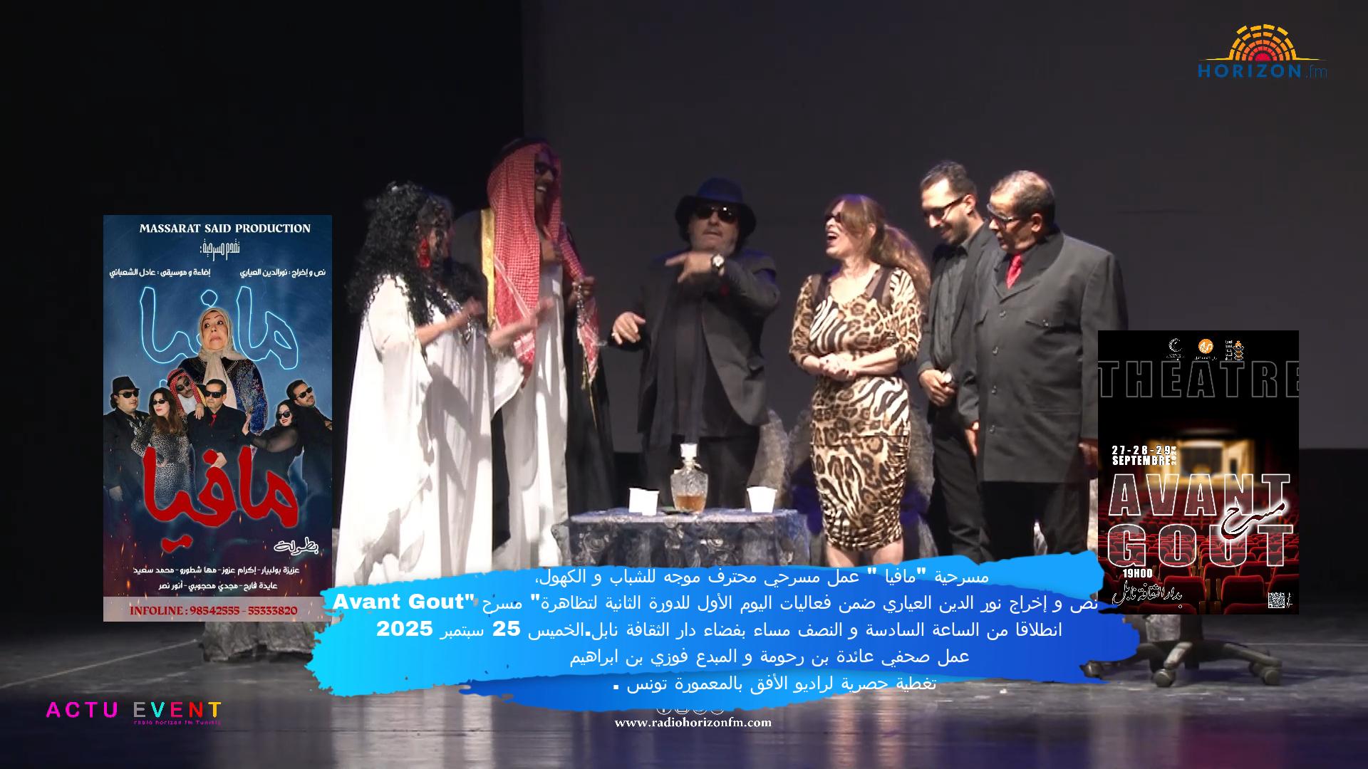 مسرحية "مافيا " عمل مسرحي محترف موجه للشباب و الكهول، نص و إخراج نور الدين العياري ضمن فعاليات اليوم الأول للدورة الثانية لتظاهرة" مسرح Avant Gout" انطلاقا من الساعة السادسة و النصف مساء بفضاء دار الثقافة نابل.الخميس 25 سبتمبر 2025عمل صحفي عائدة بن ...